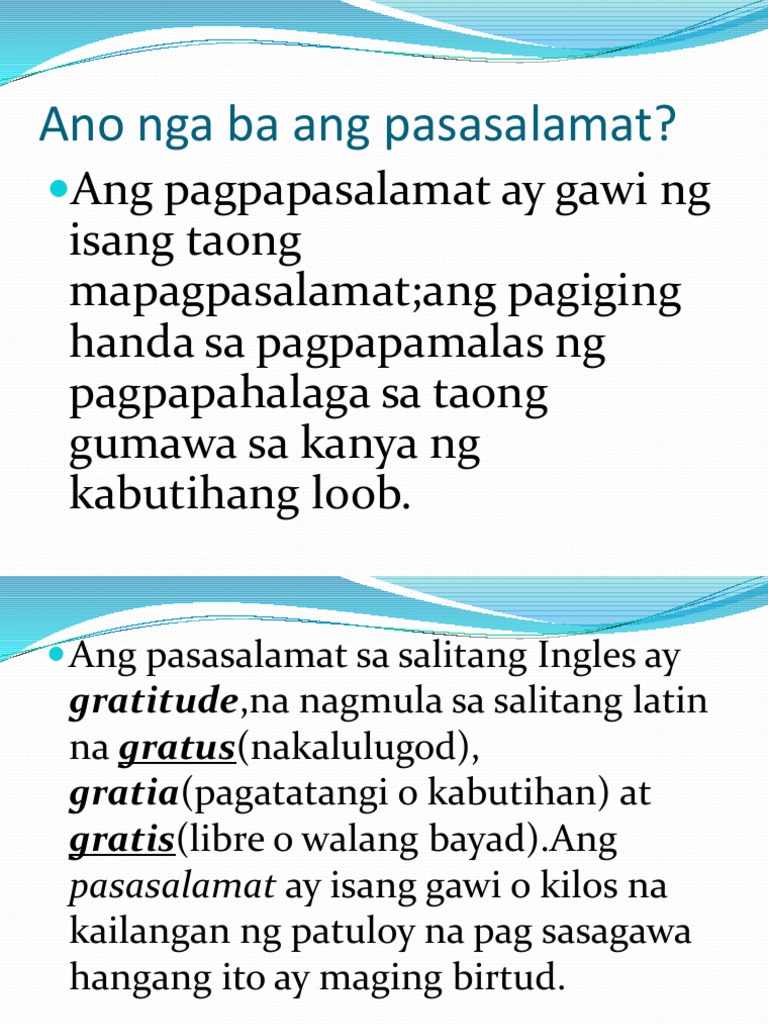 Ang salitang pasasalamat ay hango sa mga salitang Latin na GRATUS na ang ibig sabihin ay NAKALULUGOD gratia na ang kahulugan ay pagtatangi o kabutihan at gratis na nangangahulugang libre o walang bayad. Pagkilala sa kabutihang ginawa ng kapuwa. Ang salitang pasasalamat ay hango sa mga salitang Latin na gratus na ang ibig sabihin ay nakalulugod gratia na ang kahulugan ay pagtatangi o kabutihan at gratis na nangangahulugang libre o walang bayad.