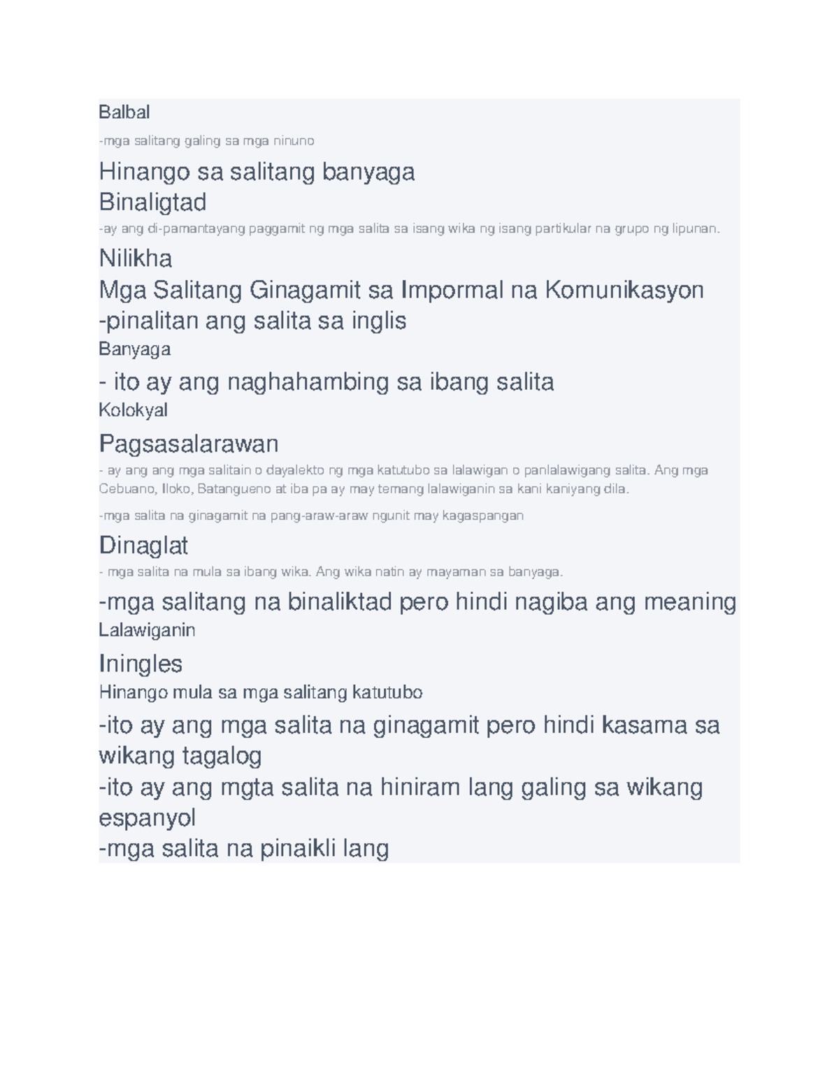 1 Asfdghfdhaghh Balbal Mga Salitang Galing Sa Mga Ninuno Hinango Sa Salitang Banyaga Binaligtad Ay Ang Di Pamantayang Paggamit Ng Mga Salita Sa Isang Wika Ng Studocu