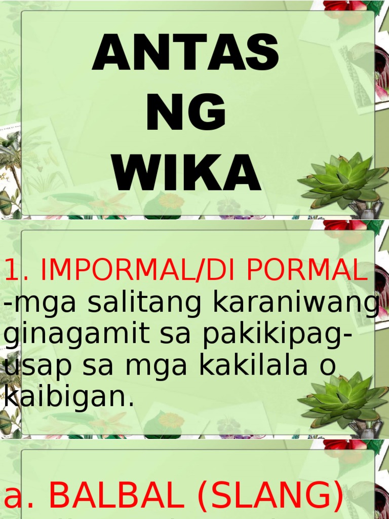 Ngunit ano ba ang balbal o slang. By hoodlums and lowlifes Ang pinakamababang antas ng wika ay balbál na mga salita. MGA SALITANG KANTO.